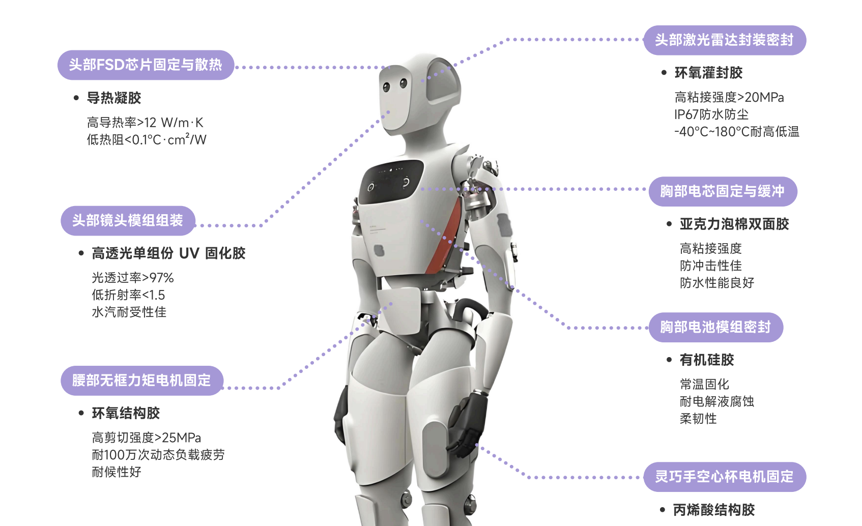 - 为无线充电模组设计了一种集绝缘、导热和固定功能于一体的粘接材料。该材料能够在确保电气绝缘的同时,有效传导热量,防止充电过程中的过热问题,同时通过其粘接性能,保证了模组的稳固安装和长期运行的可靠性。