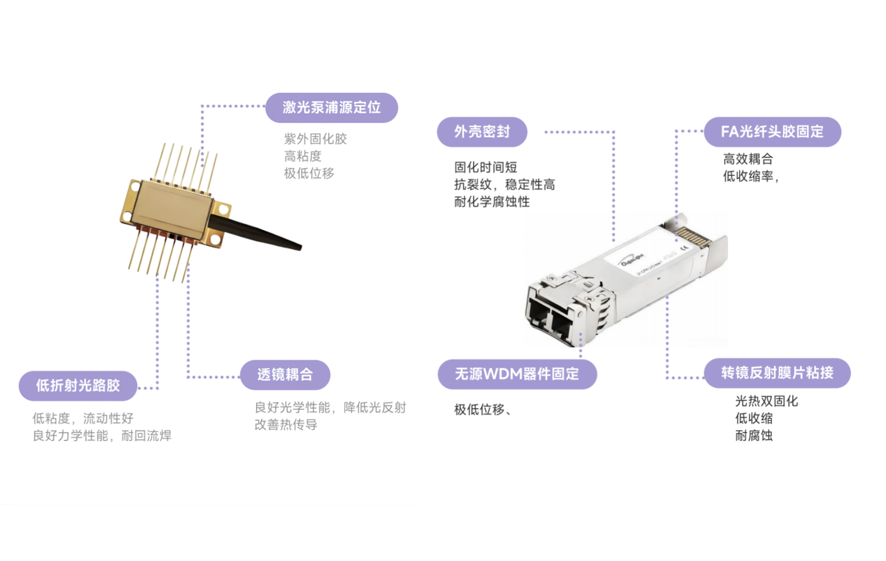 - 这些粘接剂配方通过其独特的化学和物理特性,显著提高了组装件的热稳定性和机械稳定性,减少了在温度变化或机械应力作用下可能出现的翘曲现象。